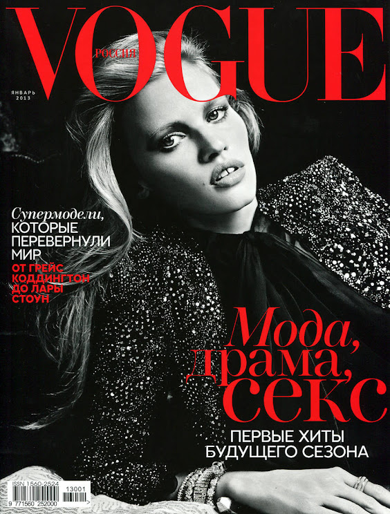 Dutch model Lara Stone photographed by Hedi Slimane for the cover shoot of the fashion magazine Vogue Russia for their January 2013 issue.